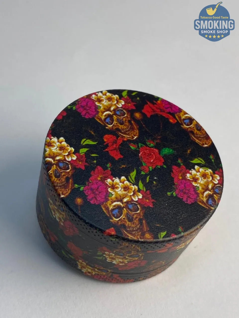 مطحنة تبغ بتصميم أنيق يجمع بين الجماجم والزهور لمحبي الستايل المختلف. مصنوع من المعدن المتين مع شفرات حادة وسطح مطلي برسومات لامعة تدوم طويلًا.